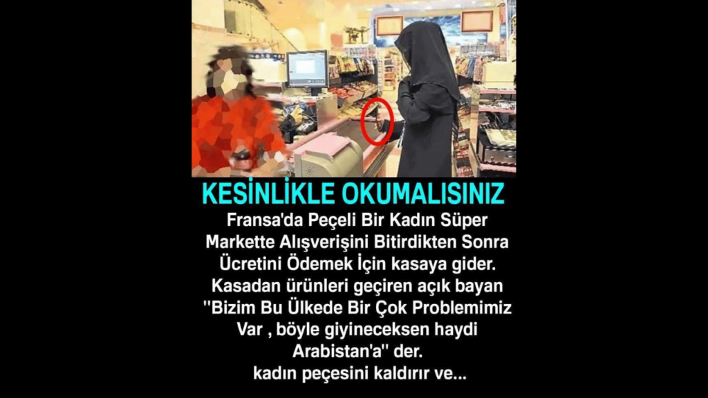Peçe’li kardeşimiz elindeki poşetleri bırakarak yüzündeki örtüyü kaldırdı… Kasiyer kadın küçük bir şok yaşadı, çünkü çarşaflı hanım bir araba benzemiyordu sarışın ve mavi gözlüydü ve şunları söyledi: “Ben bir Fransızım, Arap değilim, ve burası benim ülkem ve İSLAM BENİM DİNİM Siz Müslüman doğumlular, dininizi bize sattınız ve biz de onu sizlerden satın aldık.”